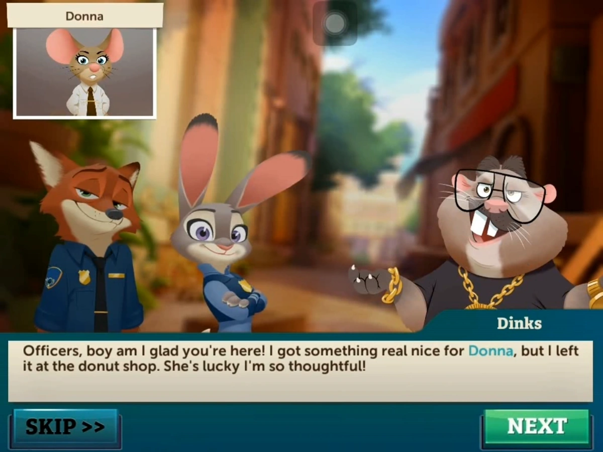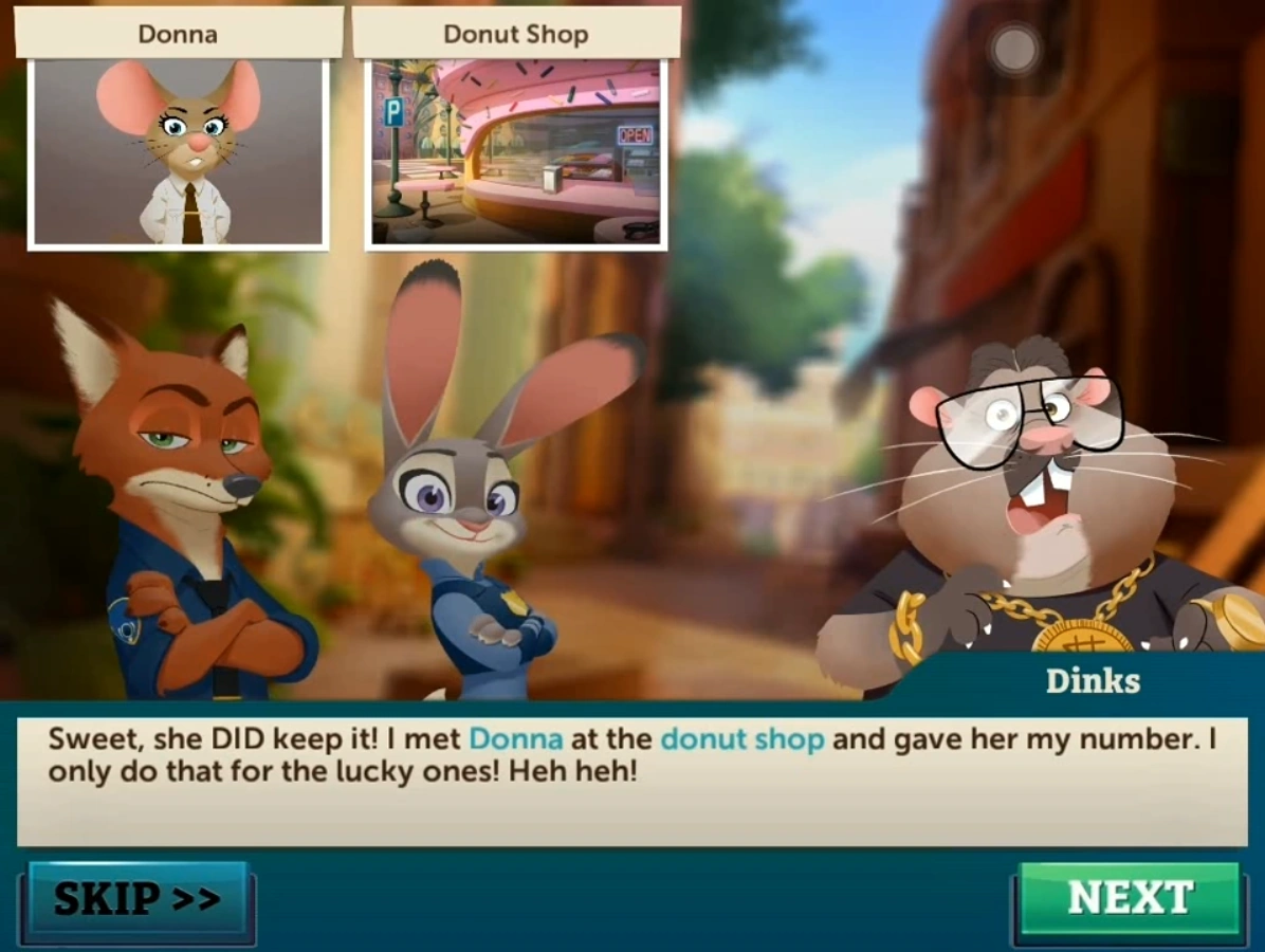While on the case of the missing necklaces, Judy Hopps and Nick Wilde find a notebook in a back alley of Savanna Central. They find a napkin with a phone number written on it and discover the number belongs to a gerbil named Dinks. They question Dinks about his number being in the notebook at the scene of the crime. Dinks says he is happy that Donna kept it, and that he met Donna at the donut shop and gave her his number. He said he only does it for "all the lucky ones". Judy says if she did lose the number, she's lucky. Nick judges Judy, saying beneath Dinks' sleazy exterior is a "sleazy interior" but he agrees with her. They learn from Donna that he left to meet a wolf named Wilfred.