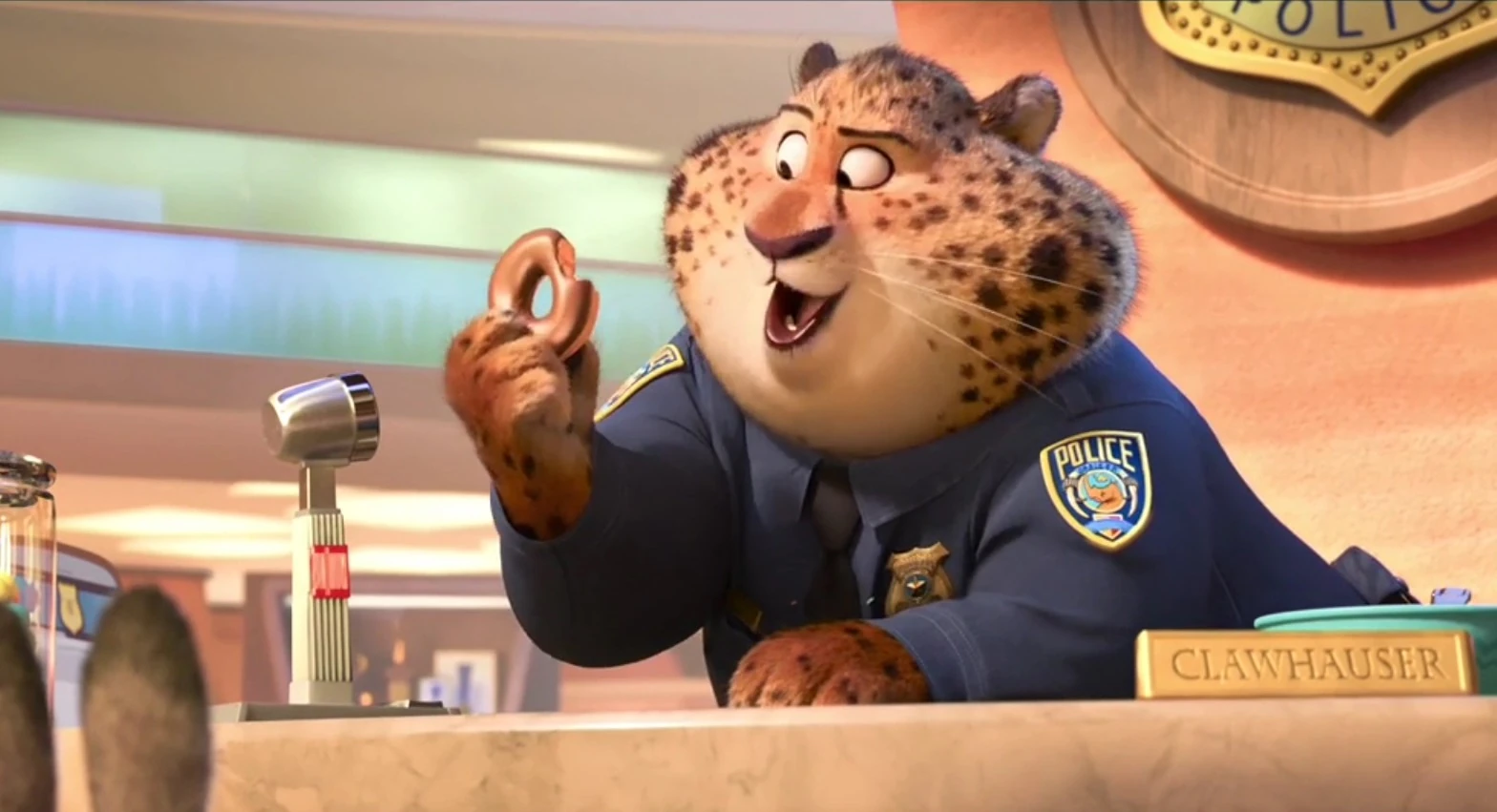 At the end of the film, after Clawhauser is reinstated as secretary for the ZPD, his colleagues, Krumpanski and Higgins, present him with two boxes of donuts, to which he happily accepts.