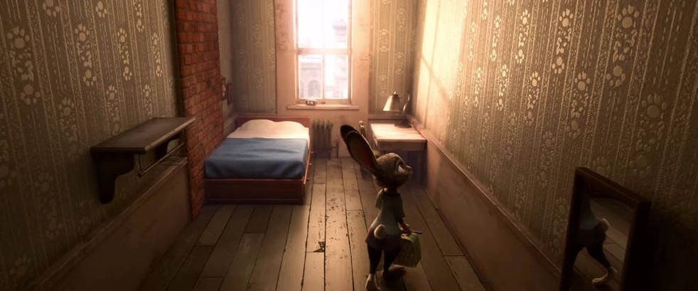 Judy realizes that her small living space has greasy walls, a rickety bed, and "crazy neighbors", but proclaims she loves her new home anyway. The next morning, Judy awakens and departs for her first day on the job at the ZPD.