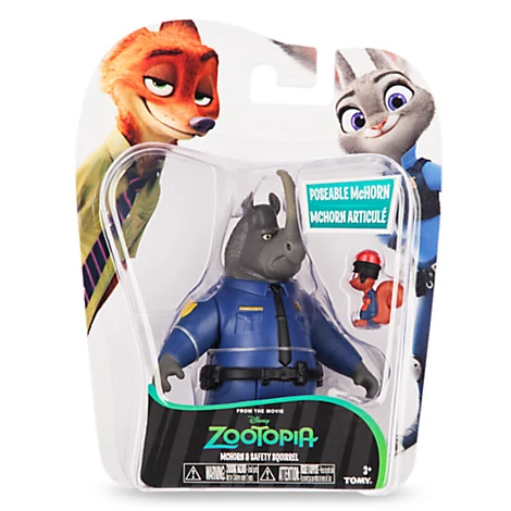 "McHorn is a hefty and strong rhinoceros police officer – bad guys, beware. But McHorn’s great size does not always work to his advantage and can sometimes weigh him down. That’s where Safety Squirrel comes into play. He does not take his job lightly, warning the other animals to stay out of the way. The poseable 4.5-inch McHorn Figure and 1-inch Safety squirrel Figure are in scale with all of the other Zootopia Character Pack Figures. Collect the entire herd of the Zootopia Character Pack Figures and Vehicles so you can recreate the scenes from Zootopia!"[1]