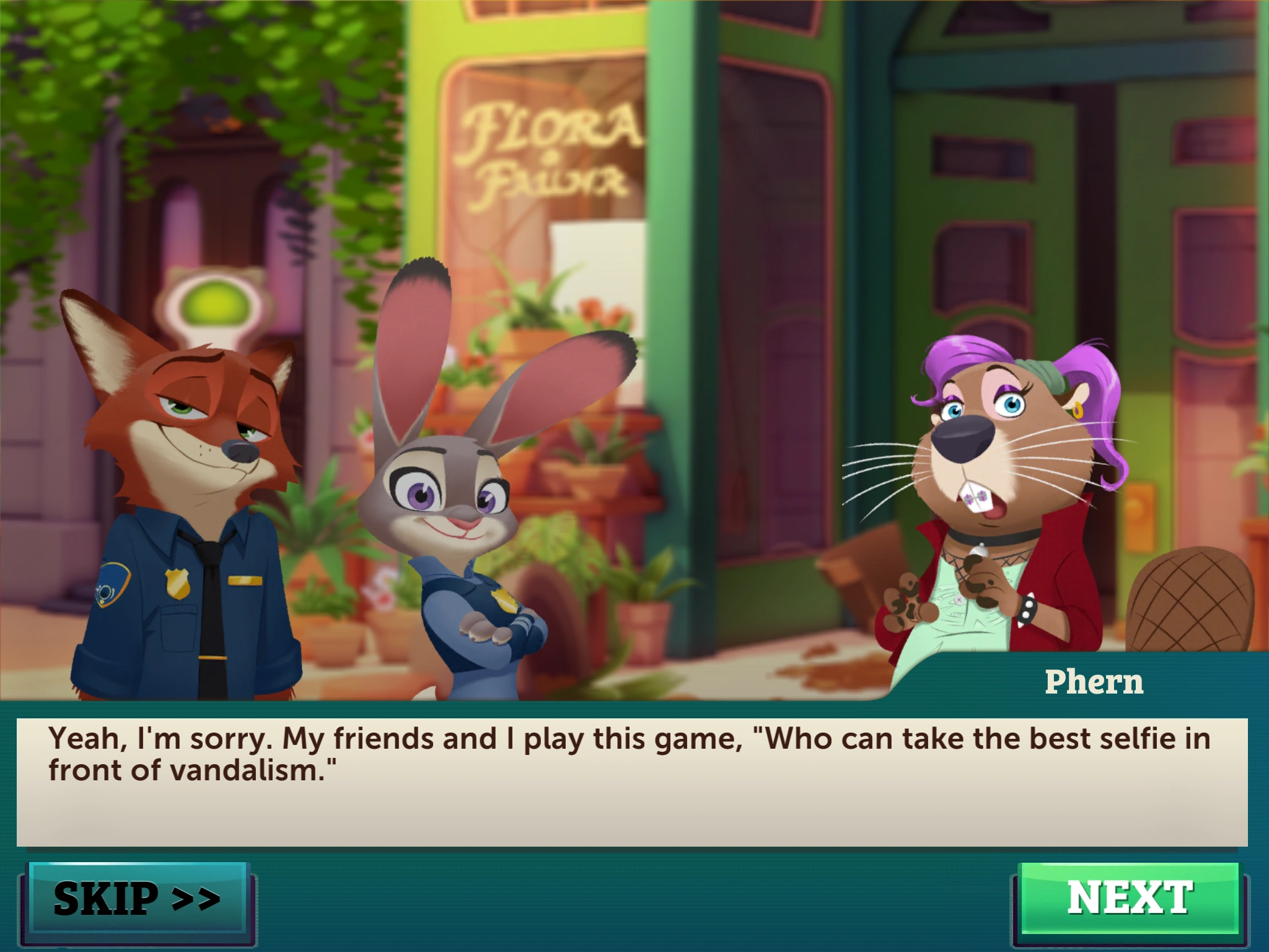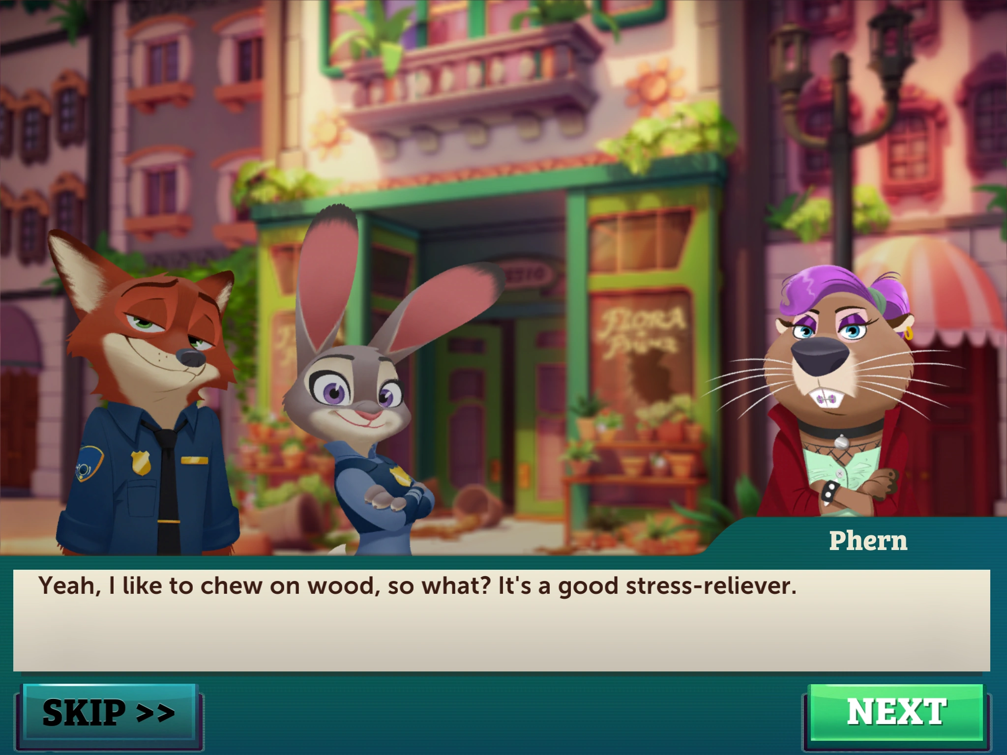 Judy Hopps and Nick Wilde find a piece of chewed wood/wood shavings in Rodney's pawn shop/Jumbeaux's Café, Phern says she likes to chew on wood, because it's a good stress-reliever. She says she heard a lot of commotion behind Flora & Fauna/Jumbeaux's, but she didn't see anything after her contacts fell out. When asked why her paws are dirty/sticky, she insults them by saying she works at a plant store/juggling lollipops.
