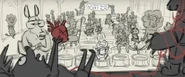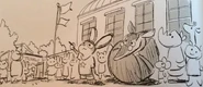 In an early version of the film's opening scene, the school's auditorium was going to serve as the location where young Judy Hopps and her peers perform in a "Zootopia Pride Day" play about the founding of their city, Zootopia. Fawn and Jaguar play a wild prey and predator and explain the history of mammal evolution. For the next act, Judy is part of a singing group, also consisting of Roary, Woody, and Sally, who perform in a musical number about the city and the opportunities it provides. Judy objects to her part in the song where she is meant to sing about wanting to grow carrots, saying she may have bigger aspirations in life that are not associated with carrots or rabbits. Mrs. Armadillo tells her that certain mammals are just better at some things than others, and that her dreams should be realistic. Warren then alerts Mrs. Armadillo that Bobby Catmull is stuck in a tree. The students and faculty make their way outside and watch as Bobby is saved when he is guided down to safety with a laser pointer by Judy.